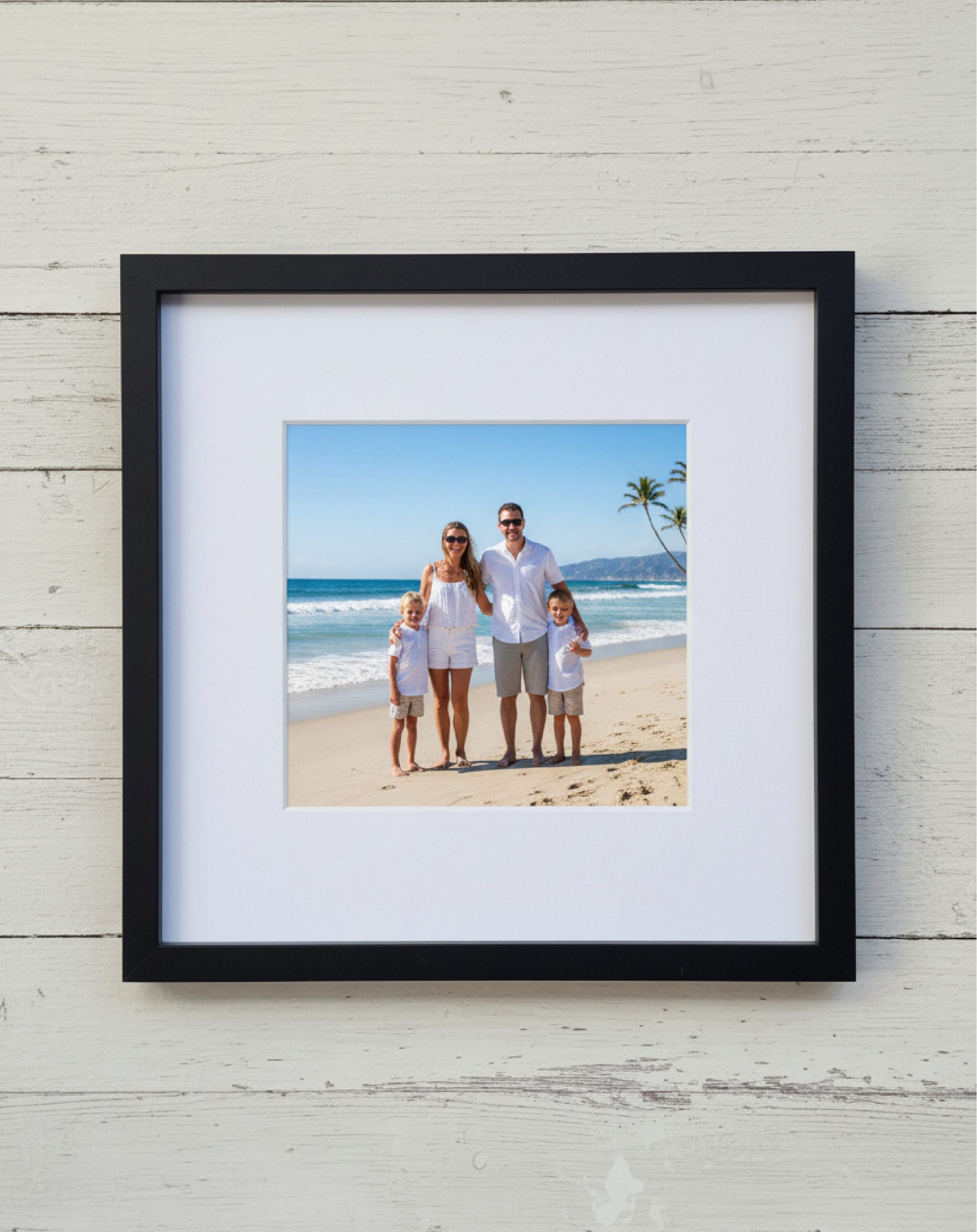 A sleek and minimalist 14×14 black wooden picture frame crafted from high-quality wood. Perfect for showcasing your favorite photos or artwork with a modern touch.